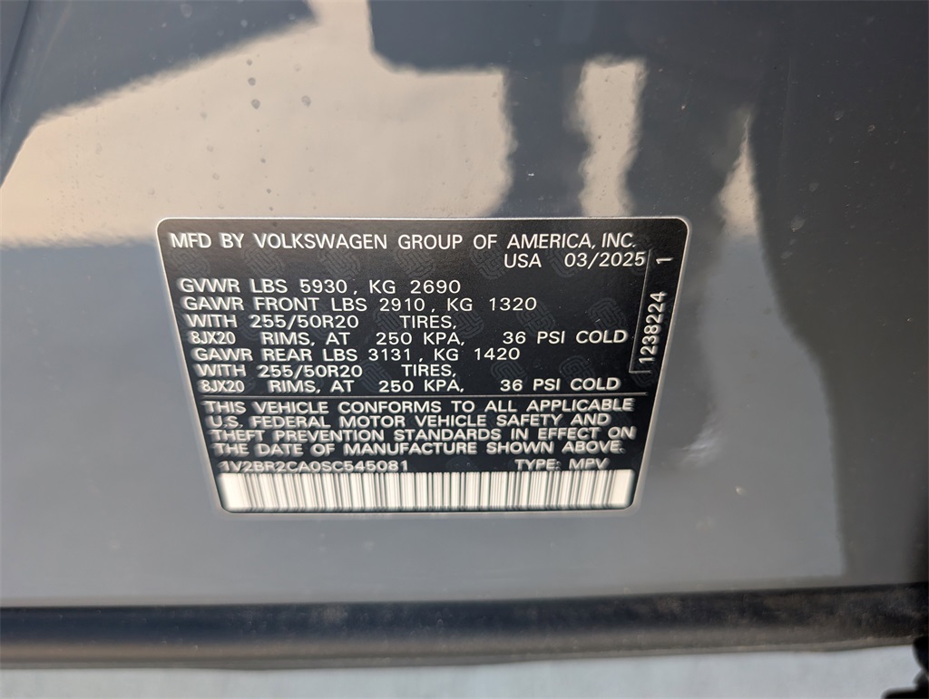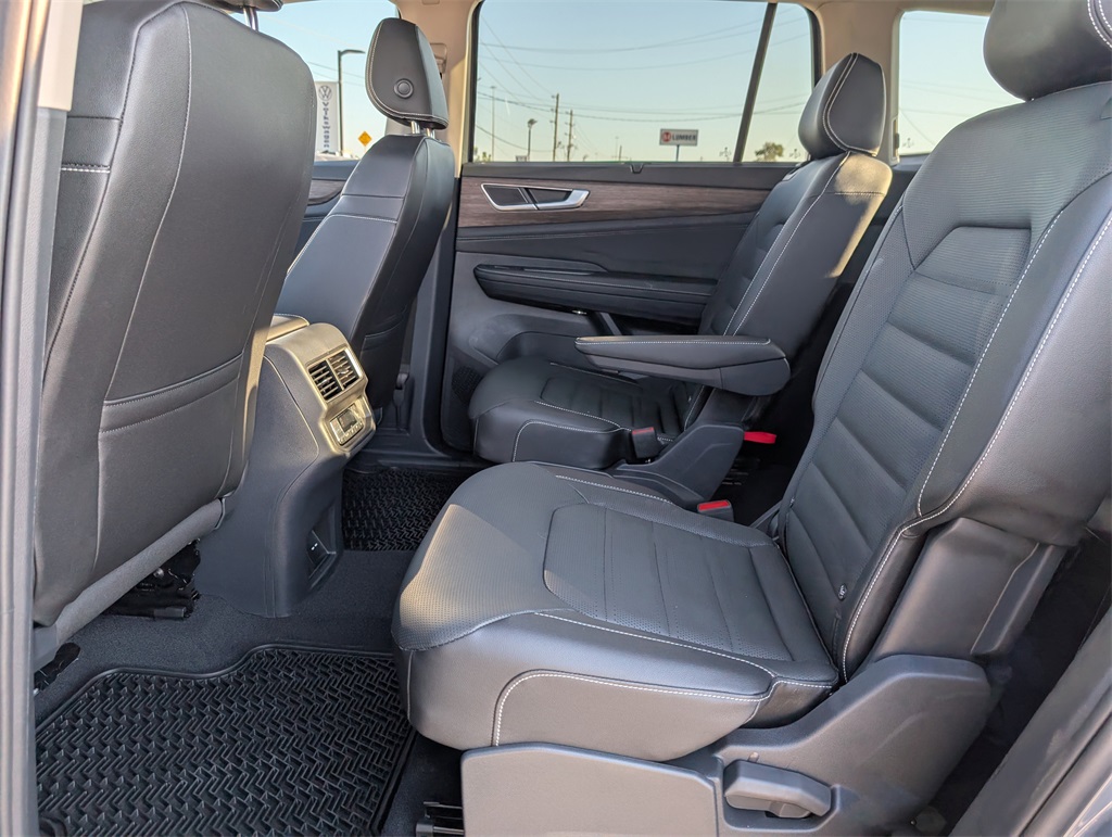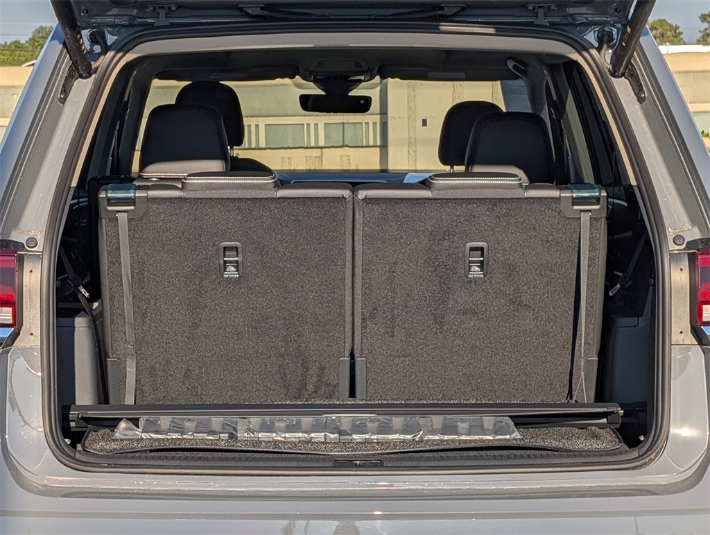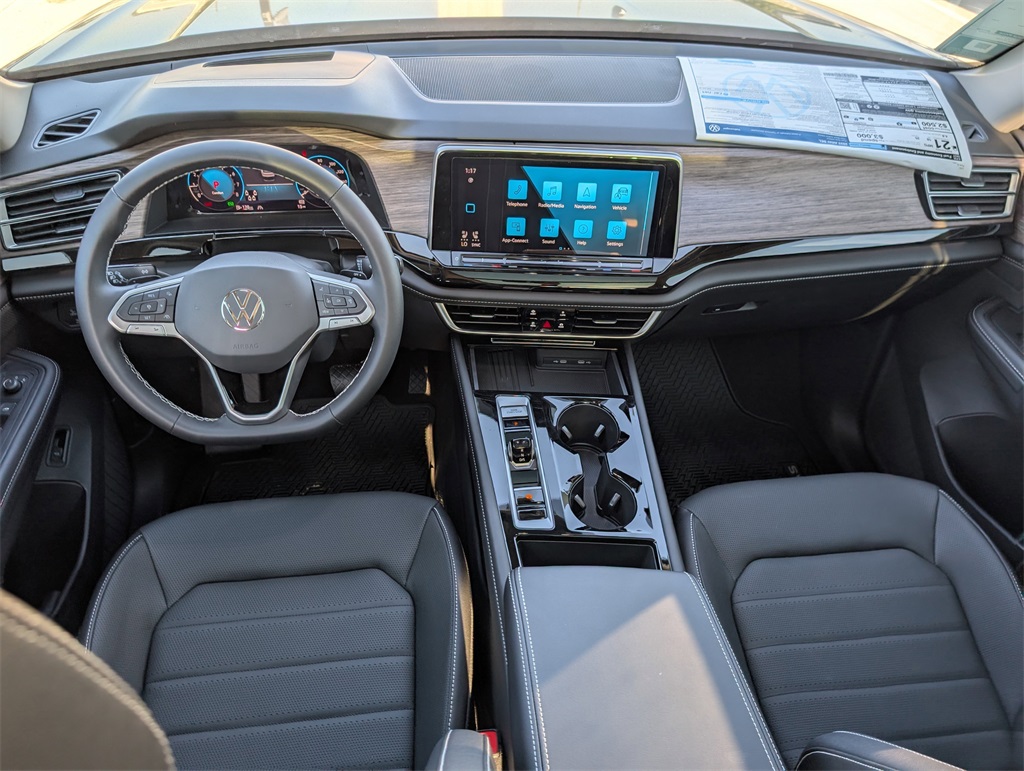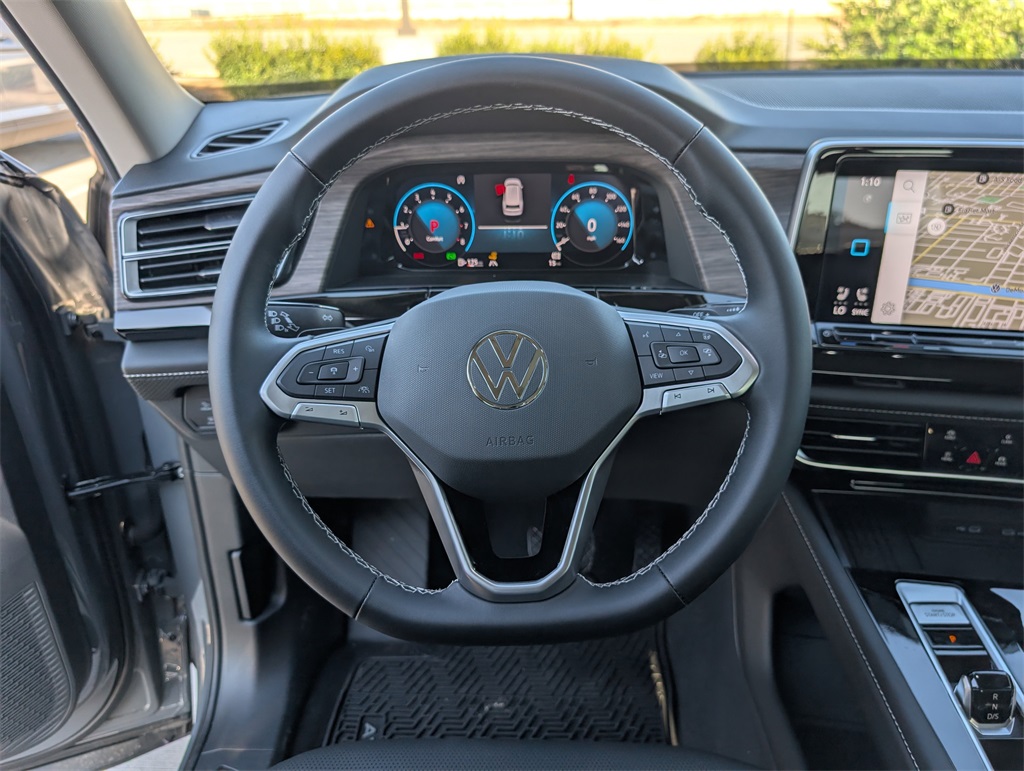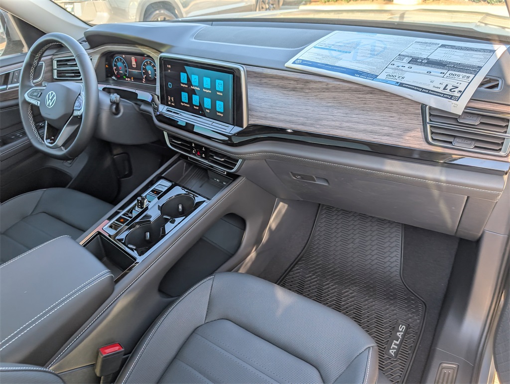 or, Compass, Delay-off headlights, Driver door bin, Driver vanity mirror, Dual front impact airbags, Dual front side impact airbags, Electronic Stability Control, Emergency communication system: VW Car-Net Safe & Secure 5-year, Exterior Parking Camera Rear, Four wheel independent suspension, Four-wheel Independent Suspension, Front anti-roll bar, Front Bucket Seats, Front Center Armrest, Front dual zone A/C, Front fog lights, Front reading lights, Fully automatic headlights, Heads-Up Display, Heated & Actively Ventilated Front Bucket Seats, Heated door mirrors, Heated front seats, Heated rear seats, Heated steering wheel, Illuminated entry, Low tire pressure warning, Memory seat, Navigation System, Occupant sensing airbag, Outside temperature display, Overhead airbag, Overhead console, Panic alarm, Passenger door bin, Passenger vanity mirror, Perforated Vienna Leather Seating Surfaces, Power door mirrors, Power driver seat, Power Liftgate, Power moonroof: Panoramic, Power passenger seat, Power steering, Power windows, Radio data system, Radio: MIB3 Discover Media w/Navigation, Rain sensing wipers, Rear air conditioning, Rear anti-roll bar, Rear reading lights, Rear seat center armrest, Rear window defroster, Rear window wiper, Remote keyless entry, Security system, Speed control, Speed-sensing steering, Split folding rear seat, Spoiler, Steering wheel mounted audio controls, Tachometer, Telescoping steering wheel, Tilt steering wheel, Traction control, Trip computer, Turn signal indicator mirrors, Variably intermittent wipers, Ventilated front seats, and Wheels: 20" 2-Tone Machined Alloy. 2025 Volkswagen Atlas 2.0T SEL 4D Sport Utility Gray 18/25 City/Highway MPG Price includes: $3500 - Retail Customer Bonus. Exp. 11/03/2025