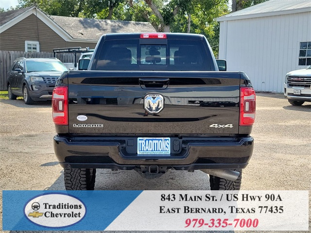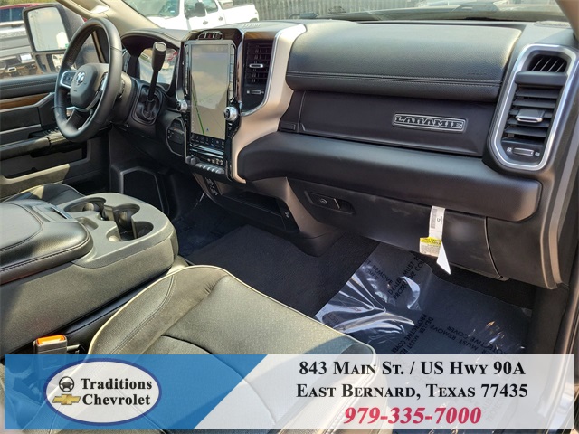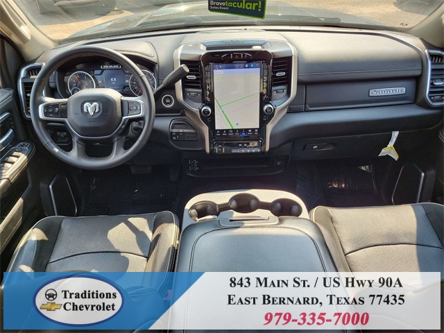 Travel & Traffic Services, Connectivity - US/Canada, Disassociated Touchscreen Display, Exterior Mirrors Courtesy Lamps, Exterior Mirrors w/Heating Element, Exterior Mirrors w/Memory, Exterior Mirrors w/Supplemental Signals, Foam Bottle Insert (Door Trim Panel), For Details, Visit DriveUconnect.com, For More Info, Call 800-643-2112, Forward & Reverse Utility Lights, Front LED Fog Lamps, Global Telematics Box Module (TBM), Google Android Auto, GPS Antenna Input, GPS Navigation, HD Radio, Integrated Voice Command w/Bluetooth, LED Reflector Headlamps, LED Tail Lamps, Mirror Running Lights, Off-Road Information Pages, ParkSense Front/Rear Park Assist System, Power Adjust Mirrors, Power Adjustable Convex Aux Mirrors, Power Adjustable Pedals w/Memory, Power Heated Fold Telescopic Mirrors w/Memory, Power Telescoping Mirrors, Radio: Uconnect 5 Nav w/12.0" Display, Rain Sensitive Windshield Wipers, Rear Power Sliding Window, Rear Window Defroster, Remote Tailgate Release, Selectable Tire Fill Alert, SiriusXM Radio Service, SiriusXM w/360L, Trailer Tow Pages, and Wheels: 18" x 8.0" Polished Aluminum), Quick Order Package 2HH Laramie, CARBRAVO CERTIFIED Certified, 10 Speakers, 115V Auxiliary Rear Power Outlet, 2 Way Rear Headrest Seat, 220 Amp Alternator, 3.73 Axle Ratio, 4 Way Front Headrests, 4-Wheel Disc Brakes, ABS brakes, Active Noise Control System, Air Conditioning, Alloy wheels, AM/FM radio: SiriusXM with 360L, Apple CarPlay/Android Auto, Automatic temperature control, Brake assist, Bumpers: body-color, Compass, Delay-off headlights, Driver door bin, Driver vanity mirror, Dual front impact airbags, Dual front side impact airbags, Electronic Stability Control, Electronically Controlled Throttle, Front anti-roll bar, Front Center Armrest w/Storage, Front dual zone A/C, Front License Plate Bracket, Front reading lights, Front Seat Back Map Pockets, Fully automatic headlights, Garage door transmitter, Heated door mirrors, Heated Front Seats, Heated front seats, Heated Steering Wheel, Heated steering wheel, Illuminated entry, Leather steering wheel, Leather Trim 40/20/40 Bench Seat, Low tire pressure warning, Manufacturer's Statement of Origin, Navigation System, Occupant sensing airbag, Outside temperature display, Overhead airbag, Overhead console, Panic alarm, ParkView Rear Back-Up Camera, Passenger door bin, Passenger vanity mirror, Power 2-Way Driver Lumbar Adjust, Power 2-Way Passenger Lumbar Adjust, Power Adjust 8-Way Driver Seat, Power Adjust 8-Way Front Passenger Seat, Power door mirrors, Power driver seat, Power passenger seat, Power steering, Power windows, Radio data system, Rear 60/40 Folding Seat, Rear anti-roll bar, Rear reading lights, Rear seat center armrest, Rear step bumper, Rear window defroster, Remote keyless entry, Security system, Speed control, Split folding rear seat, Steering wheel mounted audio controls, Tachometer, Tilt steering wheel, Tip Start, Tow Hooks, Traction control, Trip computer, Turn signal indicator mirrors, Variably intermittent wipers, and VoltmeteR. Certification Program Details: CARBRAVO CERTIFIED