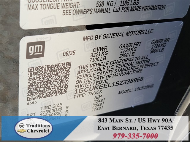 Convenience Package (10-Way Power Driver Seat w/Lumbar, 120-Volt Bed Mounted Power Outlet, 120-Volt Interior Power Outlet, Dual Rear USB Ports (Charge Only), Dual-Zone Automatic Climate Control, Electric Rear-Window Defogger, Heated Driver & Front Outboard Passenger Seats, Heated Steering Wheel, Keyless Open & Start, LED Cargo Area Lighting, Manual Tilt/Telescoping Steering Column, Remote Vehicle Starter System, Theft Deterrent System (Unauthorized Entry), and Wrapped Steering Wheel), Convenience Package II (Hitch Guidance w/Hitch View, In-Vehicle Trailering System App, Power Sliding Rear Window w/Rear Defogger, Premium Bose 7-Speaker Sound System, and Universal Home Remote), Preferred Equipment Group 1SP (12.3" Multicolor Reconfigurable Digital Display, 6-Speaker Audio System, All-Star Edition, Auto-Locking Rear Differential, Bluetooth® For Phone, Color-Keyed Carpeting Floor Covering, Deep-Tinted Glass, Electronic Cruise Control, EZ Lift Power Lock & Release Tailgate, Front Frame-Mounted Black Recovery Hooks, Front LED Fog Lamps, Front Rubberized Vinyl Floor Mats, HD Rear Vision Camera, Heated Power-Adjustable Outside Mirrors, High Gloss Black Mirror Caps, Inside Rear-View Mirror w/Tilt, Integrated Trailer Brake Controller, OnStar Services Capable, Power Front Windows w/Driver Express Up/Down, Power Front Windows w/Passenger Express Down, Power Rear Windows w/Express Down, Rear 60/40 Folding Bench Seat (Folds Up), Rear Rubberized-Vinyl Floor Mats, SiriusXM w/360L Trial Subscription, Standard Tailgate, Steering Wheel Audio Controls, Teen Driver, Tire Pressure Monitoring System, and Wi-Fi Hot Spot Capable), Trailering Package (Hitch Guidance), High Capacity Suspension Package, Leather Package (Leather-Appointed Front Seat Trim), Protection Package (Chevytec Spray-On Black Bedliner and Rear Wheelhouse Liners), RST Texas Edition Premium Package (Adaptive Cruise Control), Safety Package (HD Surround Vision, Perimeter Lighting, Rear Cross Traffic Braking, Rear Pedestrian Alert, Tra Tax, title, license and dealer fees (unless itemized above) are extra. Not available with special finance or lease offers. See Dealer for Details. Price includes: $1000 - Bonus Cash. Exp. 11/03/2025 $2500 - Customer Cash. Exp. 11/03/2