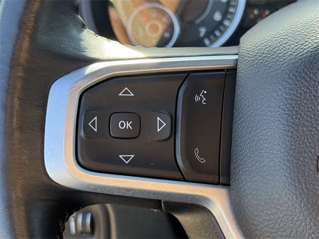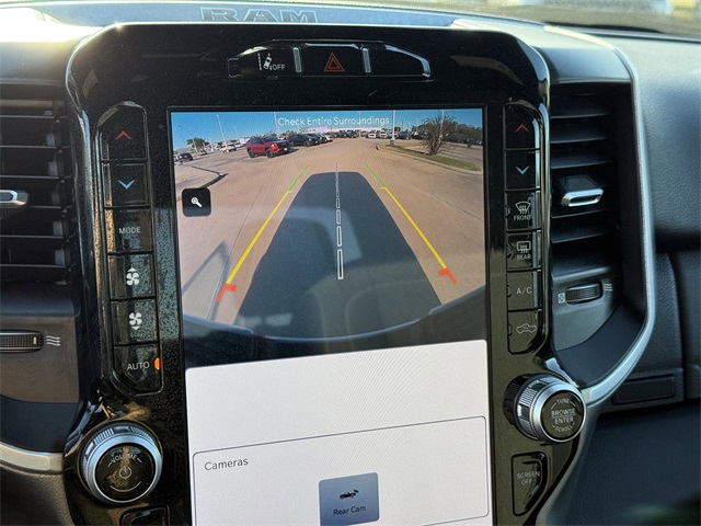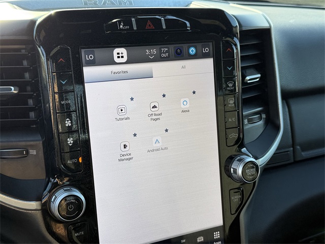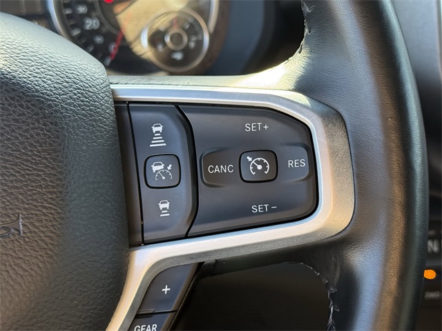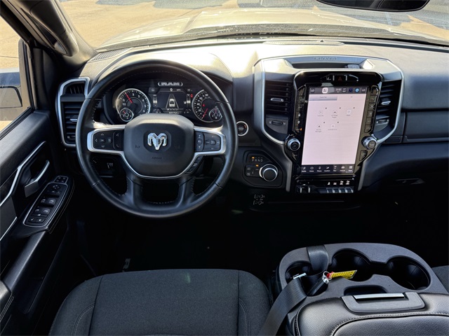 m, Apple CarPlay, Auto High Beam Headlamp Control, Auto Power-Folding Mirrors, Auto-Dimming Rear-View Mirror, Bed Utility Group, Big Horn IP Badge, Black Exterior Mirrors, Black Exterior Truck Badging, Black Headlamp Bezels, Black Interior Accents, Black Ram Head Tailgate Badge, Black Tail Lamp Bezels, Black Wheel Center Hub, Blind Spot & Cross Path Detection, Bluetooth Handsfree Phone & Audio, Body Color Door Handles, Body Color Grille Surround, Brake assist, Bumpers: chrome, Center Hub, Center Stack Storage Drawer, Cloth 40/20/40 Bench Seat, Connectivity - US/Canada, Delay-off headlights, Dual front impact airbags, Dual front side impact airbags, Dual Glove Boxes, Electronic Stability Control, Electronically Controlled Throttle, Emergency communication system: SiriusXM Guardian, Exterior Mirrors Courtesy Lamps, Exterior Mirrors w/Heating Element, Exterior Mirrors w/Supplemental Signals, Foam Bottle Insert (Door Trim Panel), Footwell Courtesy Lamp, For Details, Visit DriveUconnect.com, For More Info, Call 800-643-2112, Forward & Reverse Utility Lights, Front anti-roll bar, Front Armrest w/Cupholders, Front Center Armrest w/Storage, Front Center Seat Cushion Storage, Front Fog Lamps, Front reading lights, Front Seat Back Map Pockets, Full Speed Forward Collision Warning Plus, Fully automatic headlights, Global Telematics Box Module (TBM), Gloss Black Nostrils/MIC Black Grille, Glove Box Lamp, Google Android Auto, GPS Antenna Input, GPS Navigation, Heated door mirrors, Illuminated entry, Integrated Center Stack Radio, Integrated Voice Command w/Bluetooth, Lane Keep Assist, Leather Wrapped Steering Wheel, LED Bed Lighting, LED Tail Lamps, Level 1 Equipment Group, Locking Lower Glove Box, Low tire pressure warning, Manual Adjust 4-Way Driver Seat, Manual Adjust 4-Way Front Passenger Seat, Mirror Running Lights, MOPAR Deployable Bed Step, MOPAR Spray In Bedliner, Night Edition, Occupant sensing airbag, Off-Road Information Pages, Outside temperature display, Overhead airbag, Overhead console, Painted Flat Cab-Length Side Steps, Painted Front Bumper, Painted Rear Bumper, Panic alarm, ParkSense Front/Rear Park Assist System, ParkView Rear Back-Up Camera, Power 2-Way Driver Lumbar Adjust, Power Adjust 8-Way Driver Seat, Power Adjust Mirrors, Power Adjustable Convex Aux Mirrors, Power door mirrors, Power Heated Fold Telescope Mirrors, Power Telescoping Mirrors, Premium Cloth 40/20/40 Bench Seat, Premium Cloth 40/20/40 Bench Seat (DISC), Protection Group, Quick Order Package 2GZ Big Horn, Radio: Uconnect 5 W w/8.4" Display (A62), Rain Sensitive Windshield Wipers, Rear 60/40 Folding Seat, Rear anti-roll bar, Rear Dome w/On/Off Switch Lamp, Rear Folding Seat, Rear seat center armrest, Rear step bumper, Remote keyless entry, Remote USB Port - Charge Only, Safety Group, Selectable Tire Fill Alert, SiriusXM Radio Service, SiriusXM Satellite Radio, Speed control, Steering Wheel Mounted Audio Controls, Storage Tray, Tilt steering wheel, Tip Start, Tow Hooks, Traction control, Trip computer, Turn signal indicator mirrors, Variably intermittent wipers, Voltmeter, Wheels: 18" x 8.0" Polished Aluminum, Wheels: 20" x 8.0" Black Painted Aluminum. CARFAX One-Owner.