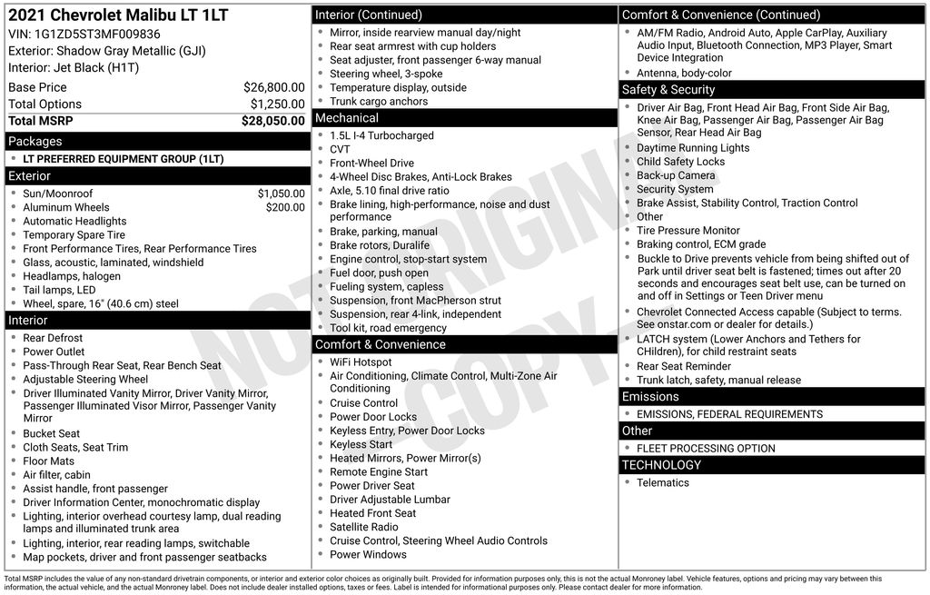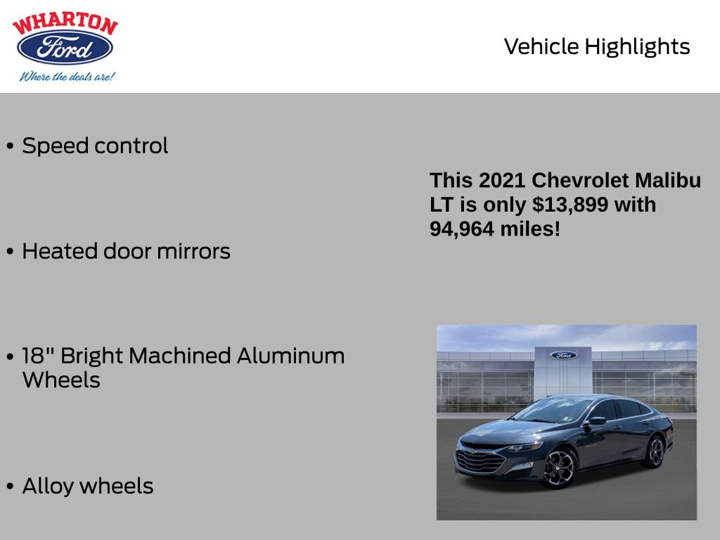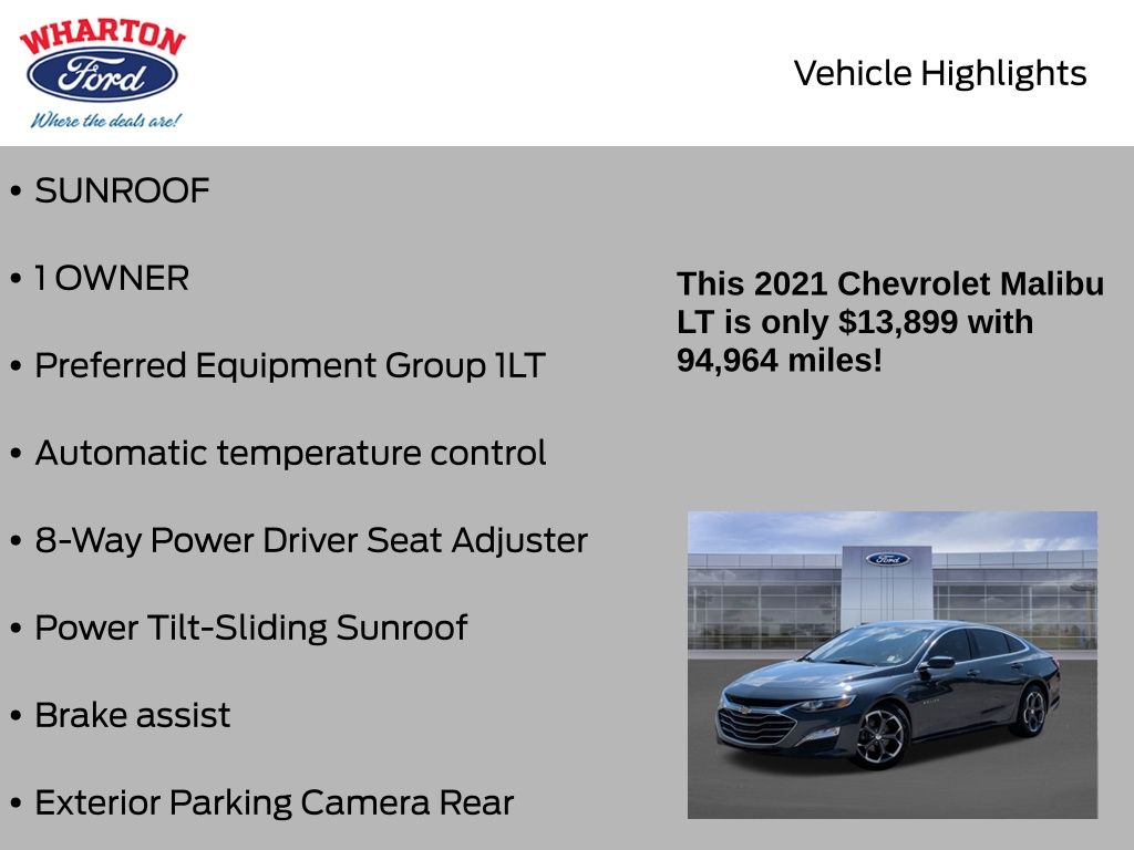 Shadow Gray Metallic 2021 Chevrolet Malibu LT FWD CVT 1.5L DOHC SUNROOF, 1 OWNER, Jet Black Cloth, 18" Bright Machined Aluminum Wheels, 8-Way Power Driver Seat Adjuster, Alloy wheels, Automatic temperature control, Brake assist, Exterior Parking Camera Rear, Heated door mirrors, Power Tilt-Sliding Sunroof, Preferred Equipment Group 1LT, Speed control.